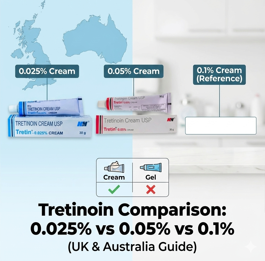 Tretinoin Comparison: 0.025% vs 0.05% vs 0.1% – Cream or Gel? (UK & Australia Guide)